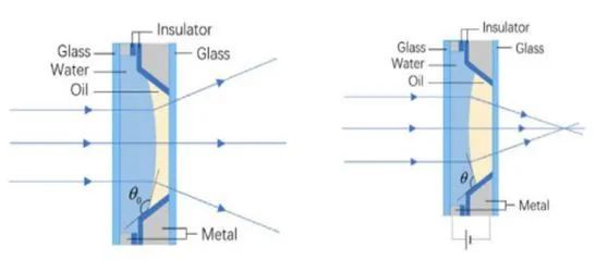 其原理如图所示,整个液态镜头在正常情况下为一块完整的凹透镜,当其受到110V电压的刺激后,液面就会发生变化,形成一个凸透镜,产生所谓的聚光效果。变焦范围宽、响应速度快、结构简单是其最大的优点,但110V的电压对于手机来说还是偏高了些,如何将驱动电压控制在一个手机可接受的范围内,是目前小米所遇到的最大难题。