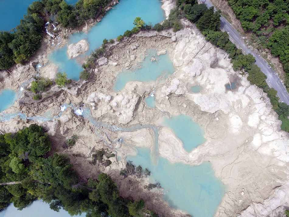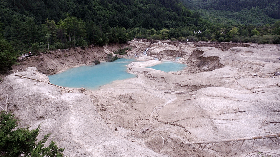 2017年8月10日,四川阿坝,航拍震后的九寨沟景区,著名景点火花海干涸见底,部分海子两岸出现塌方,水面浑浊。